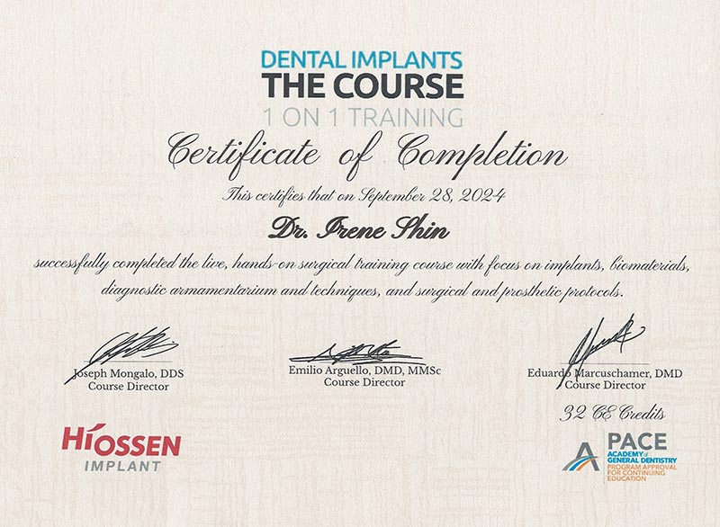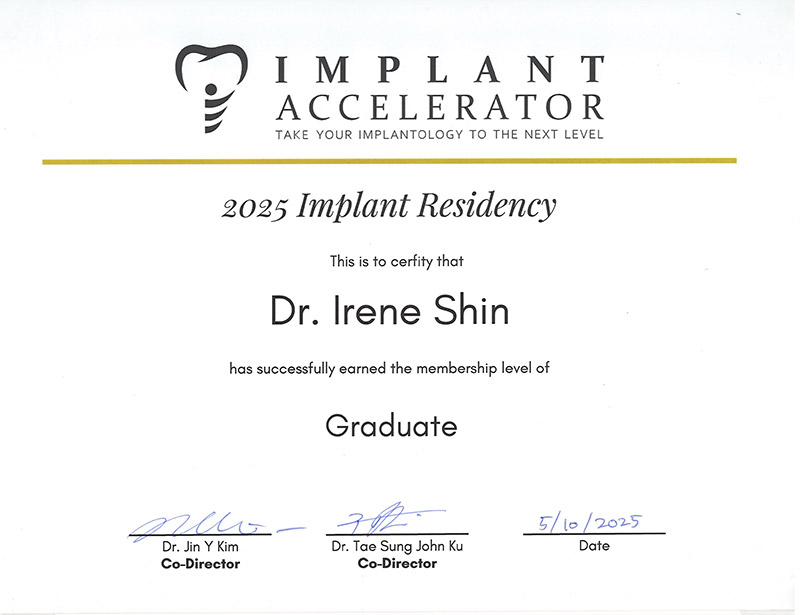 Dr. Irene Shin went to the University of Maryland to earn her Bachelor of Science in Biology. Dr. Shin perused additional research trainings studying stem cell research at the National Institutes of Health (NIH) and published scientific peer reviewed journals. She attended the University of Michigan School of Dentistry, the #1 ranked dental school in the United States and in the world, according to QS World University Rankings. Dr. Shin received an advanced dental implant certificate in October 2024. In her spare time, she spends her free time with her family and her daughter.